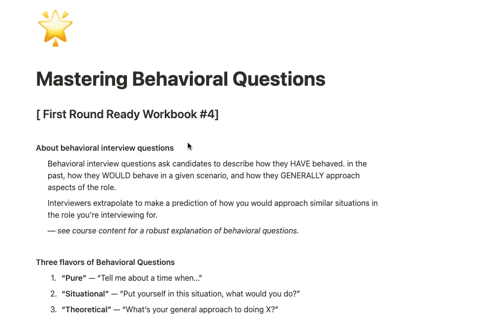NOTE This workbook is not meant to be used stand-alone. It's meant to be used with the First Round Ready Course (link). It may be a bit less useful to you if you purchase this workbook without first learning FRR.